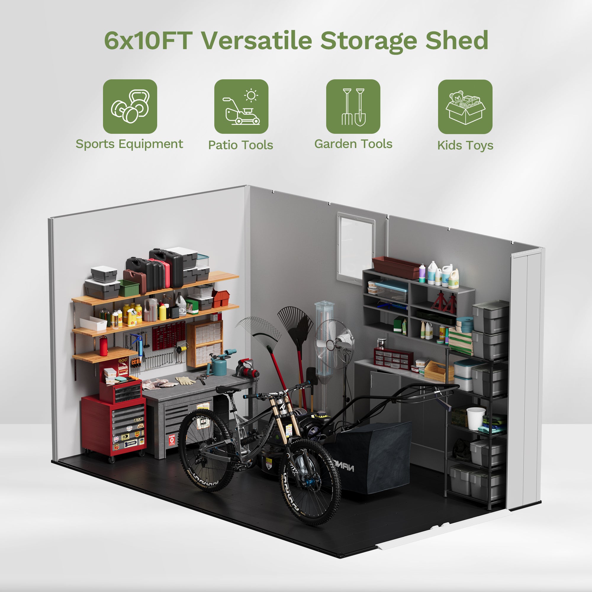 Meet your ultimate storage solution—the 6x10ft plastic garden shed. Designed for homeowners who need serious space, this shed offers robust protection against the elements while keeping your tools, equipment, and seasonal items perfectly organized. Its generous dimensions easily accommodate large items like riding mowers, multiple bicycles, or workshop tools, and the thoughtful inclusion of a window and vents creates a bright, well-ventilated interior.