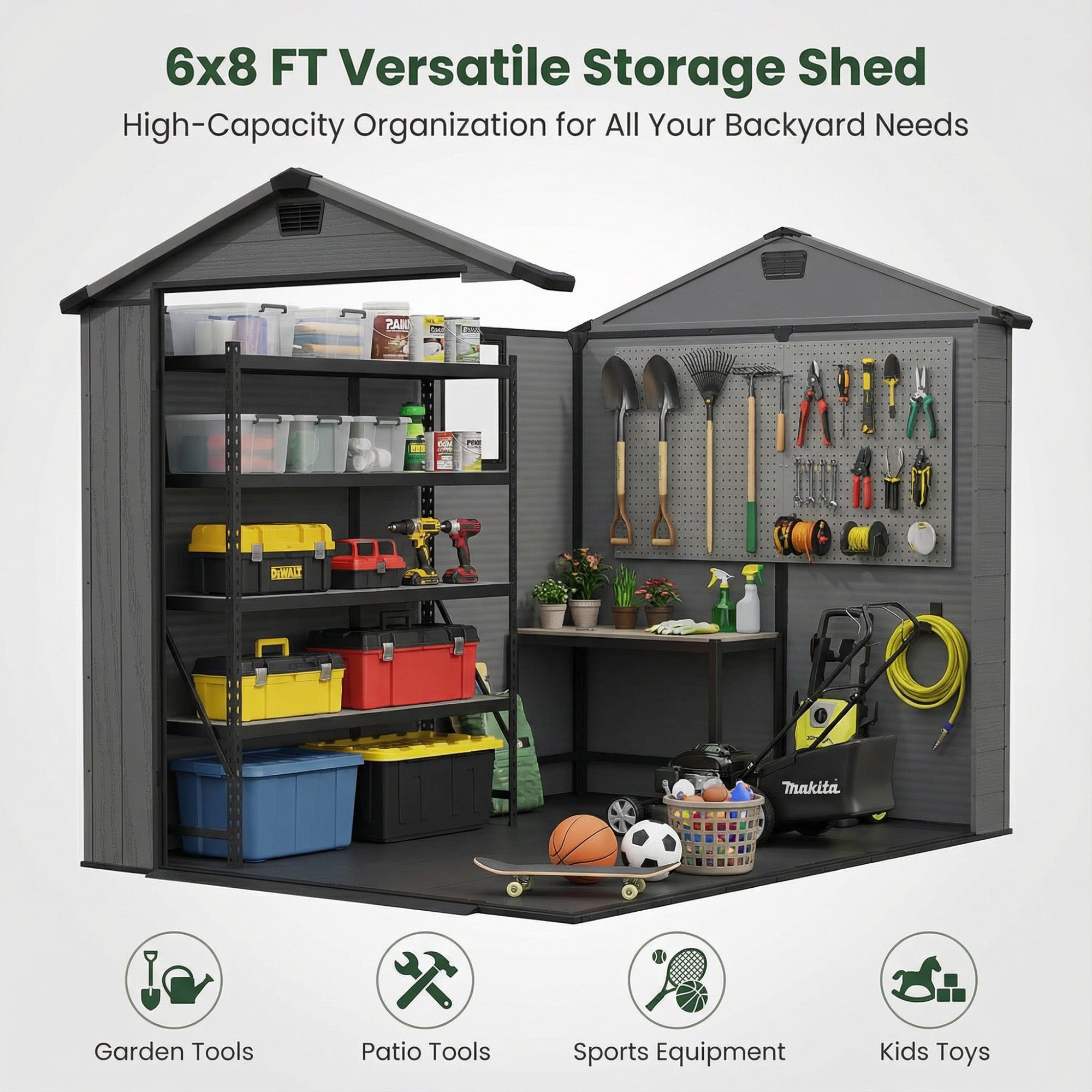 This 6x8ft plastic storage shed delivers exceptional space and durability for all your storage needs. Designed to withstand changing seasons, it provides reliable, long-lasting protection for garden tools, lawn equipment, bicycles, patio furniture, and more. The practical built-in window brightens the interior, while ventilation slots combat moisture buildup—ensuring a clean,...