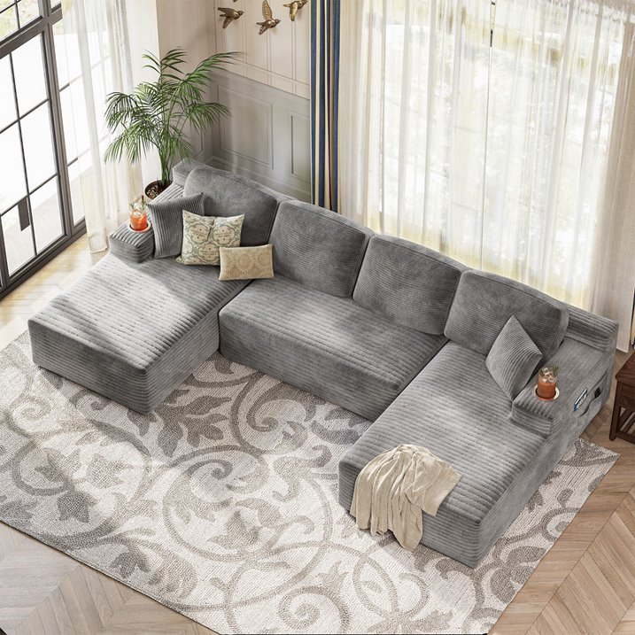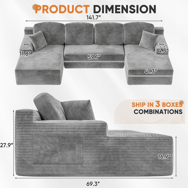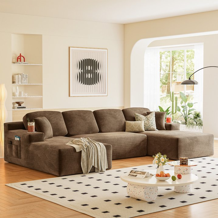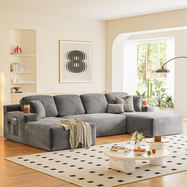 Homall U-Shaped Modular Sofa seamlessly blends contemporary design with practical functionality, creating an ideal relaxation space for your home. Featuring an elegant U-shaped modular design with sleek lines and premium plush corduroy fabric, it maximizes space efficiency while exuding sophisticated style. When placed against a wall, it creates an enduring visual centerpiece for living rooms, apartments, and bedrooms. Each module moves independently through narrow passages, effortlessly adapting to various settings like living rooms, bedrooms, and children's play areas to meet your family's evolving needs. The ergonomically designed chaise incorporates a high-resilience sponge structure and spacious seating, delivering cloud-like comfort that contours perfectly to your body and provides superior support beyond traditional boneless couch. Sink into the silk-like softness of the plush corduroy fabric, where unique texture and subtle sheen ensure year-round comfort and gentle pampering. Best of all, no assembly is required—simply unbox and experience immediate comfort as the sofa fully expands to its luxurious state within 72 hours, making home furnishing effortlessly enjoyable.