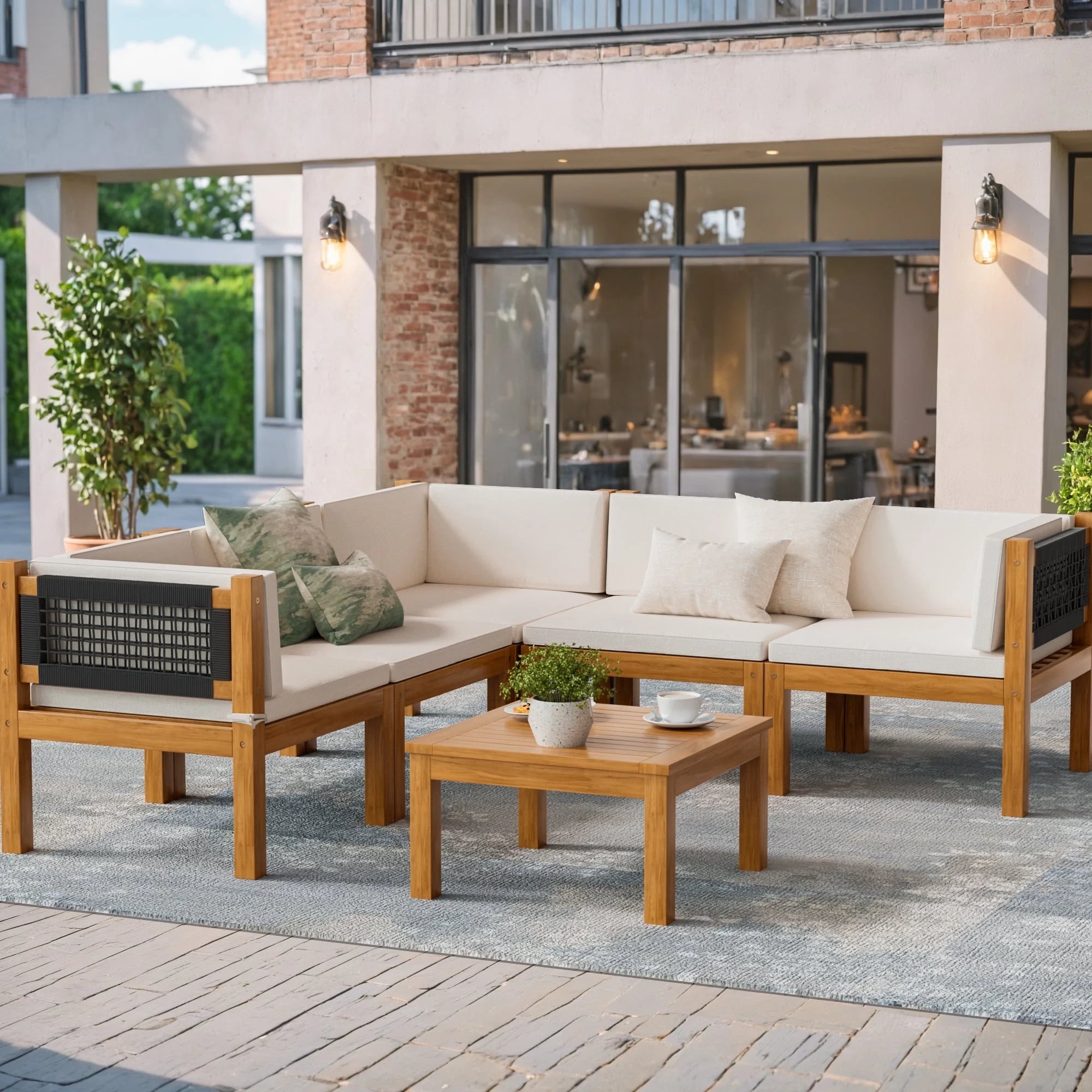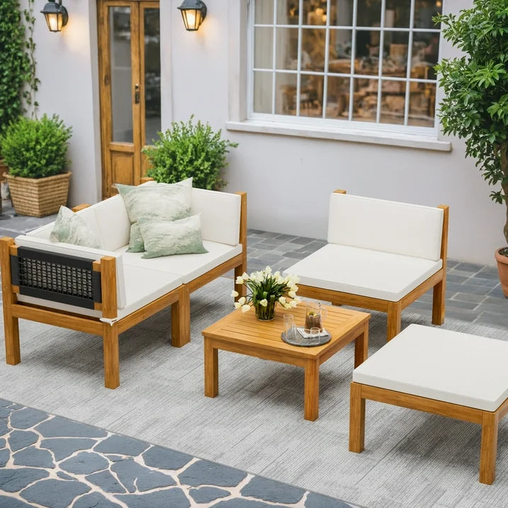 Homall Acacia Patio Conversation Set can be a good choice for you. It has two solid acacia corner chair, 1 armless chair,1 ottoman and a side table which is sturdy in use. They were made of whole solid wood, compared with MDF wood, acacia wood is more sturdy and durable. The thick cushions are filled with elastic foam and the cover is made of premium fabric. The cushions are fasten by rope helping to fix the cushion on the seat. It is a high recommended furniture set suits in your porch, yard and poolside. Enjoy your outdoor leisure time with Homall Acacia Patio Furniture Set.