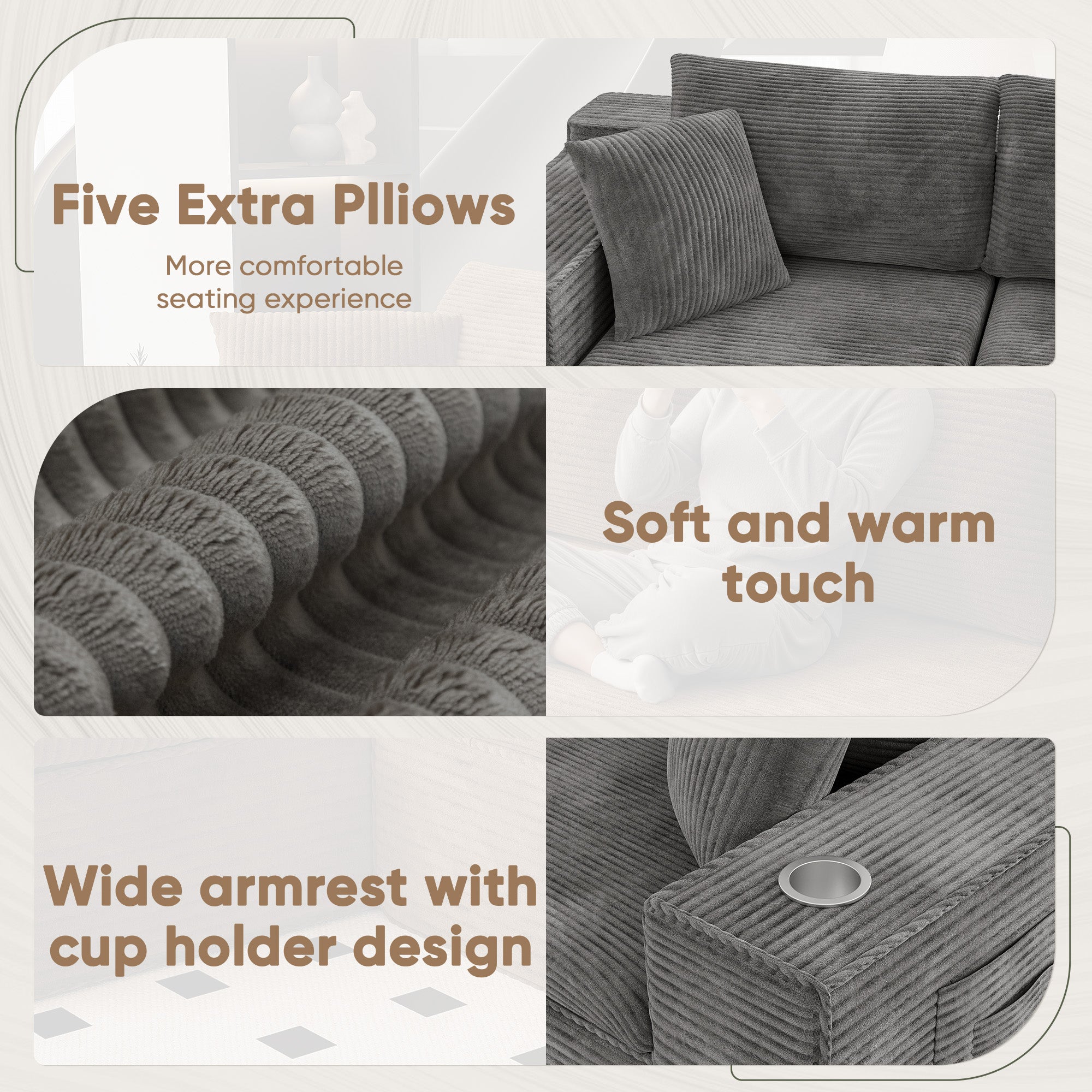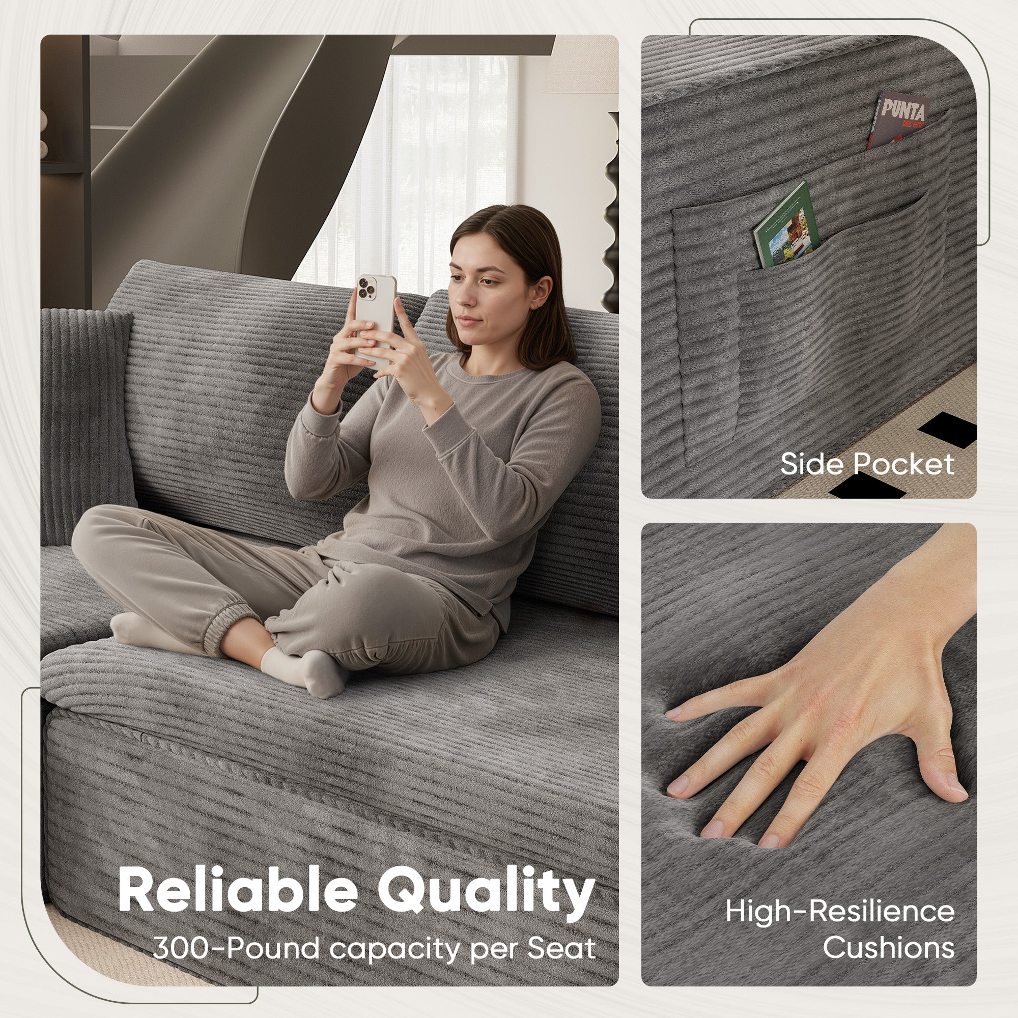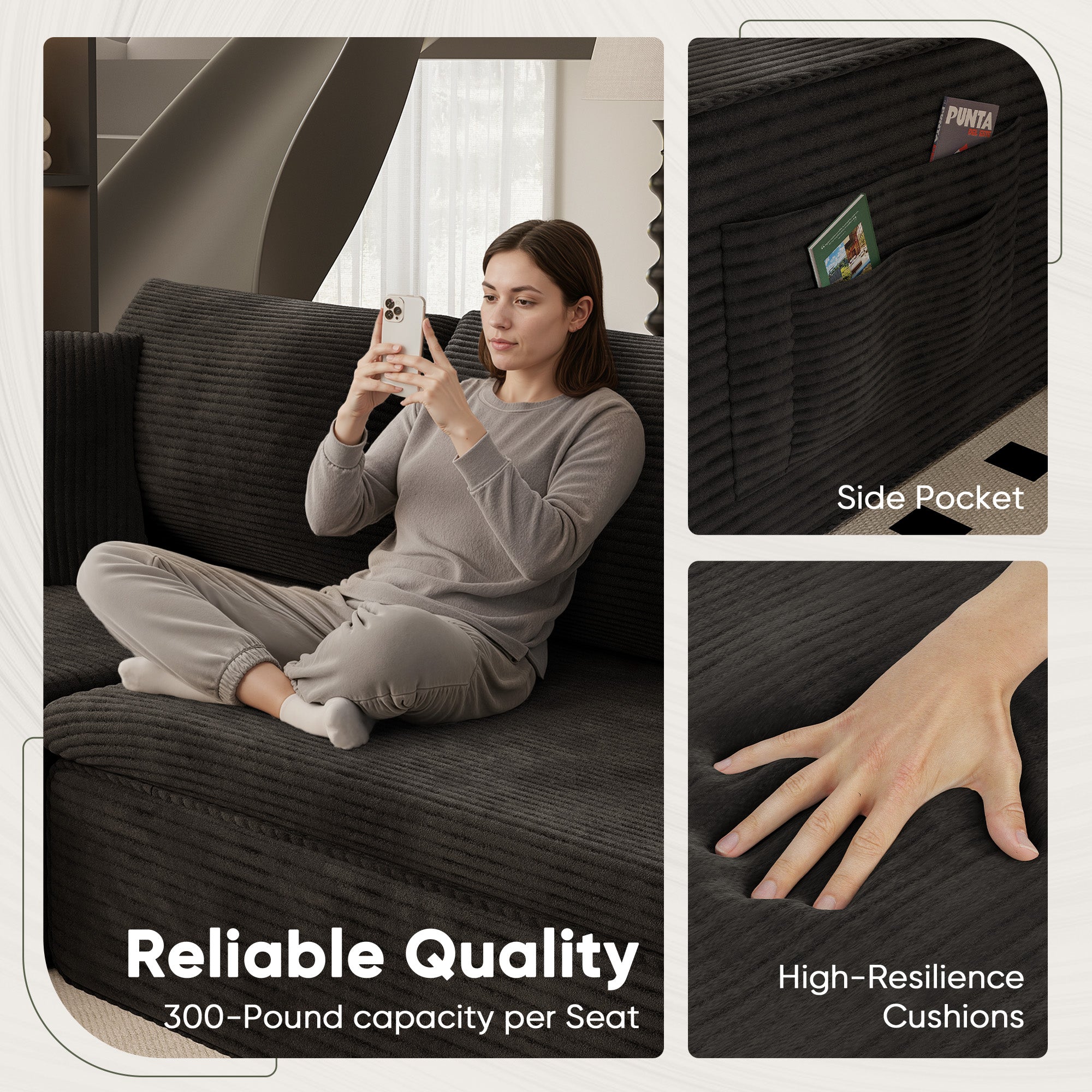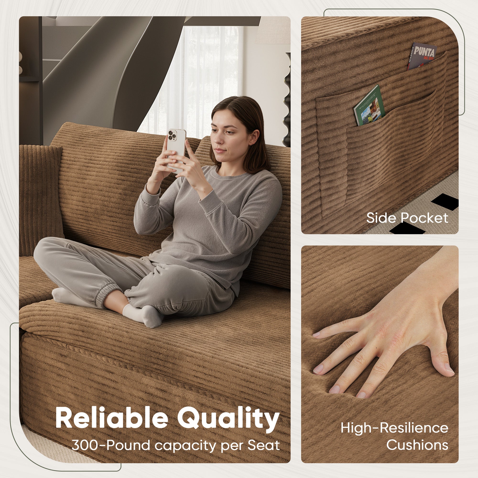• 🛒【Comfortable Sectional Couch】Crafted with breathable fabric and high-resilience memory foam, it delivers a cloud-like seating experience. The upgraded wrinkle-resistant corduroy fabric offers exceptional softness, adding warmth and sophistication to any room, with high-quality materials ensuring lasting comfort throughout the seasons.