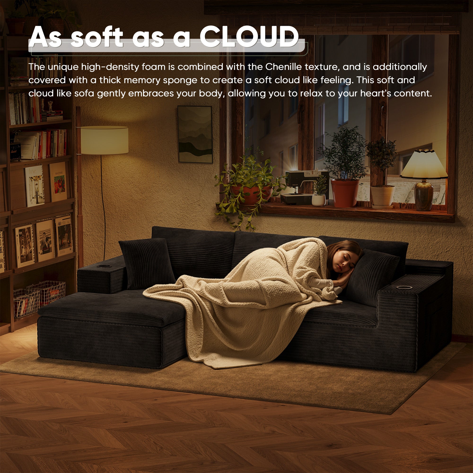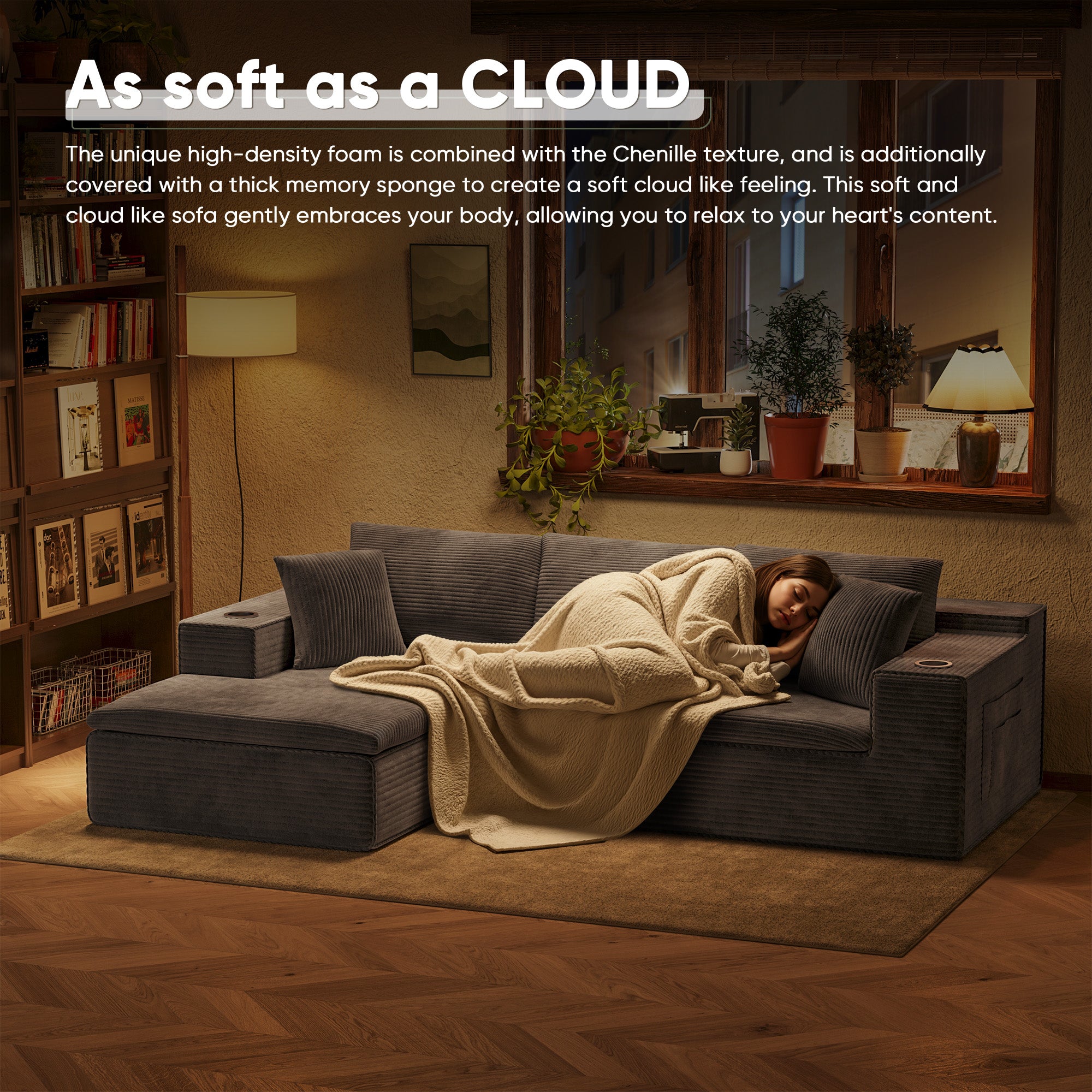 • 🛒【Spacious Seating Space】Boasting a generous 59-inch seat depth, it provides ample space for you and your family. Whether sleeping, relaxing, lounging, or reading, this modular sofa ensures comprehensive comfort and tranquility.