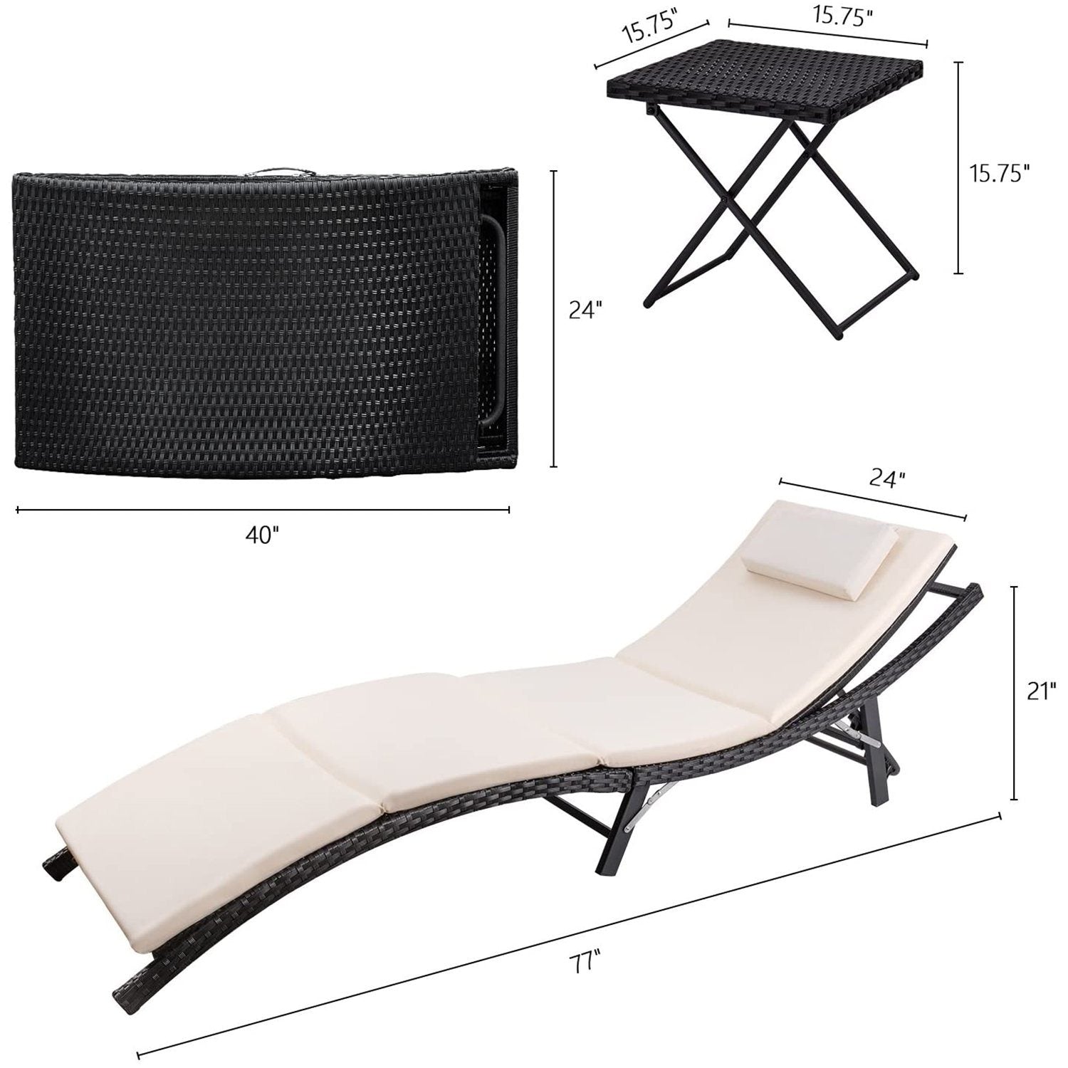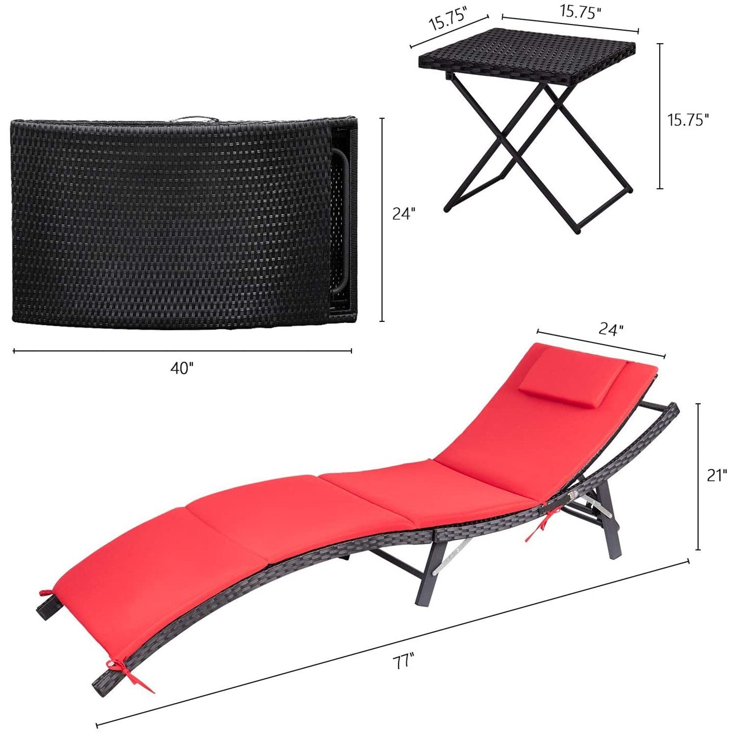 - Folding chaise lounge: 40 inch(L)X 5 inch(W)X 24 inch (H)