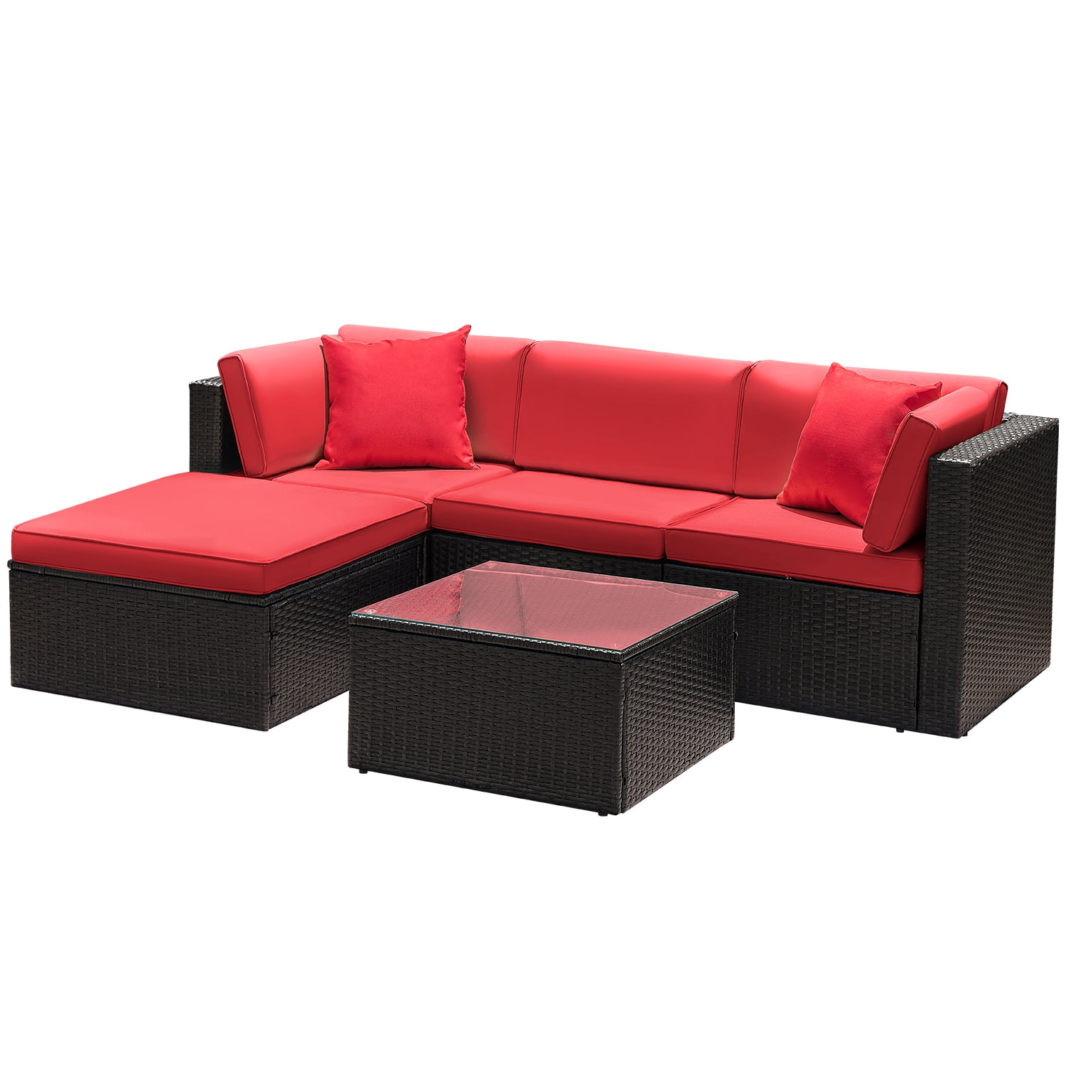 Lacoo 5 Pieces Patio Sectional Sofa Sets All-Weather PE Rattan Conversation Sets With Glass Table, Red