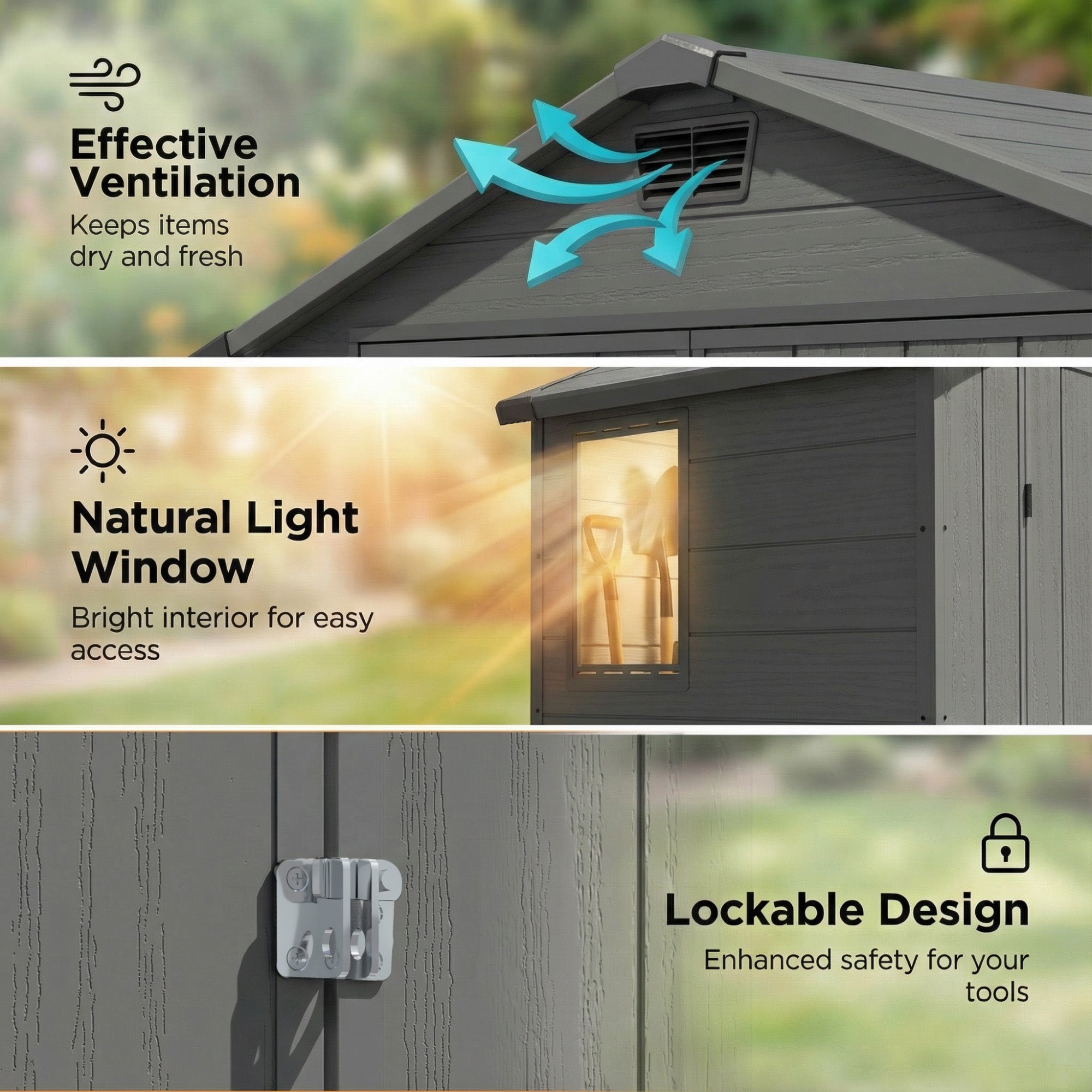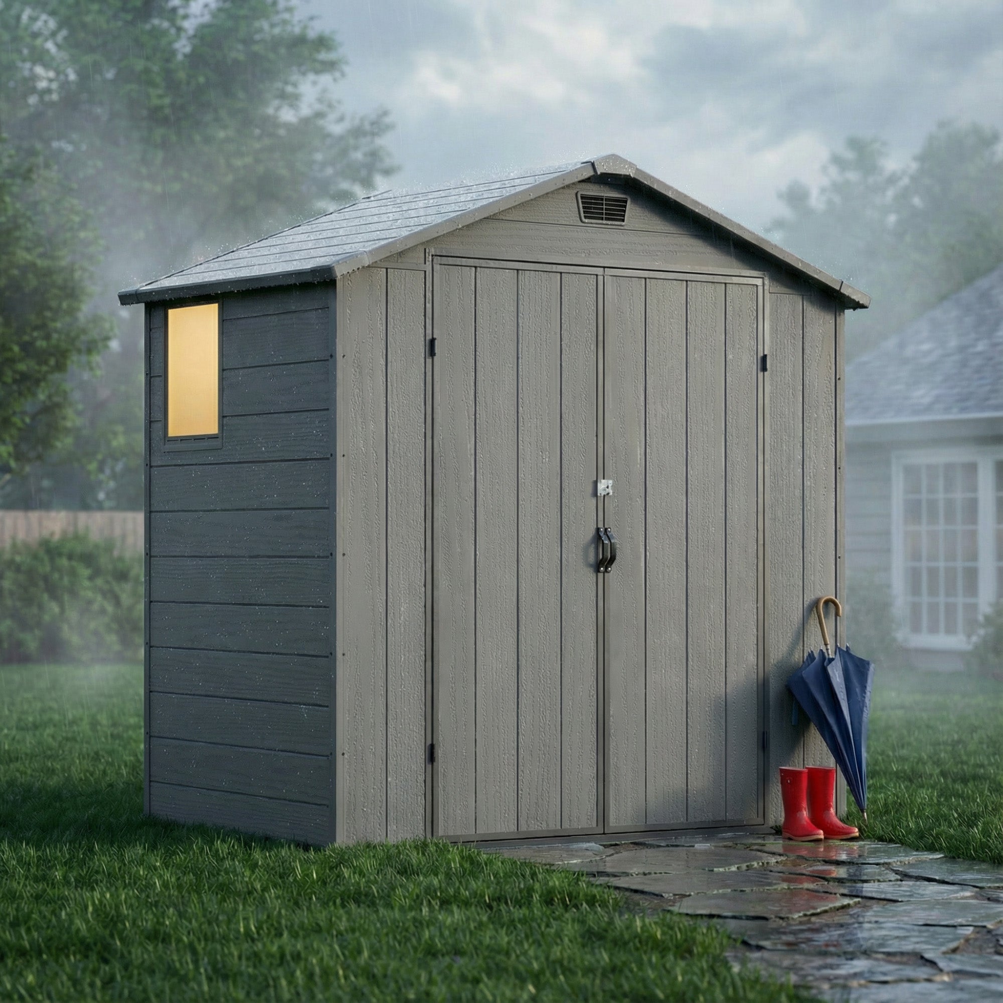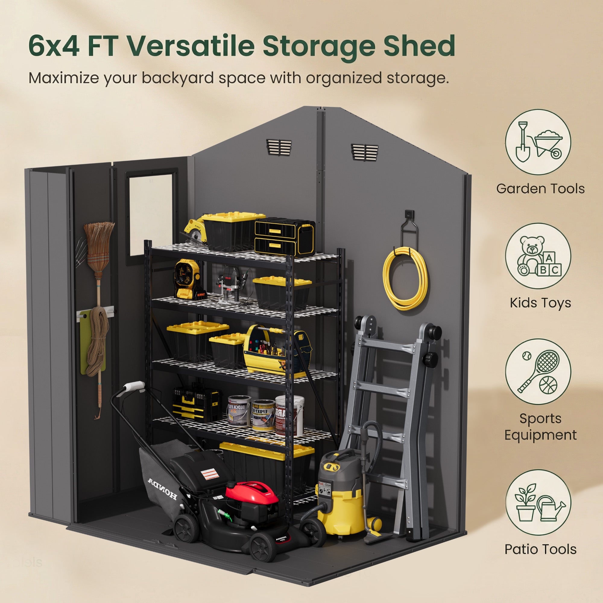 Keep your garden tools, outdoor equipment, and household items organized and protected with our 6x4ft Plastic Storage Shed. Engineered for durability, this shed resists harsh weather conditions year-round, ensuring your belongings stay safe and dry. The thoughtful design includes a built-in window to brighten the interior and ventilation slots to prevent dampness and mildew.