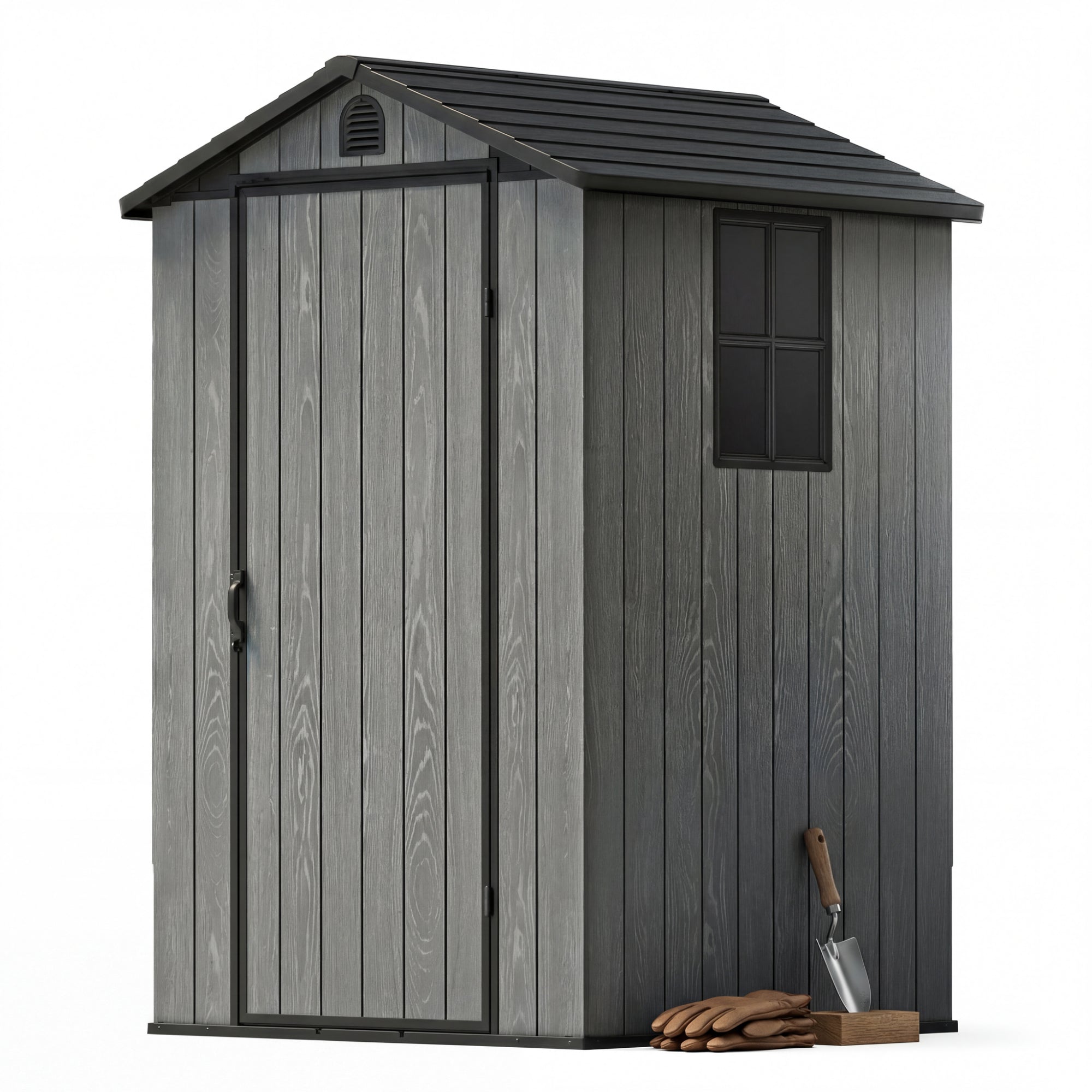 The new arrival of the HOMALL 4 ft. x 4 ft. plastic shed is an ideal choice for your outdoor storage needs. The gray walls and wood-look design are stylish and will blend seamlessly into your backyard or garden. Whether you need a place to store tools, gardening equipment, or a secure spot for bikes, this shed has you covered.