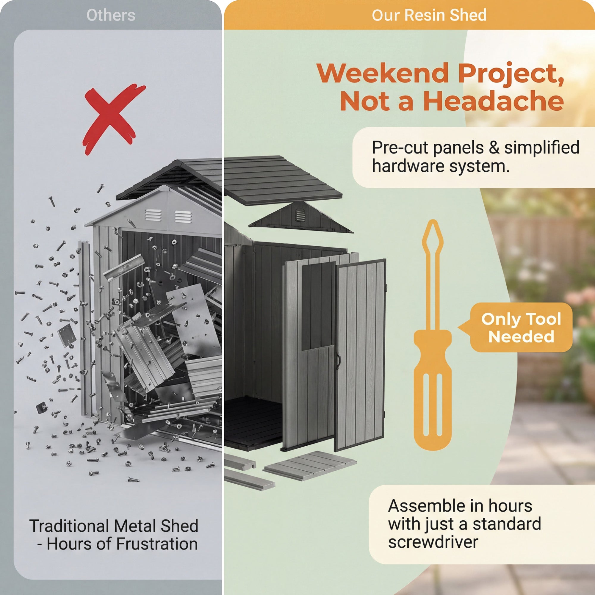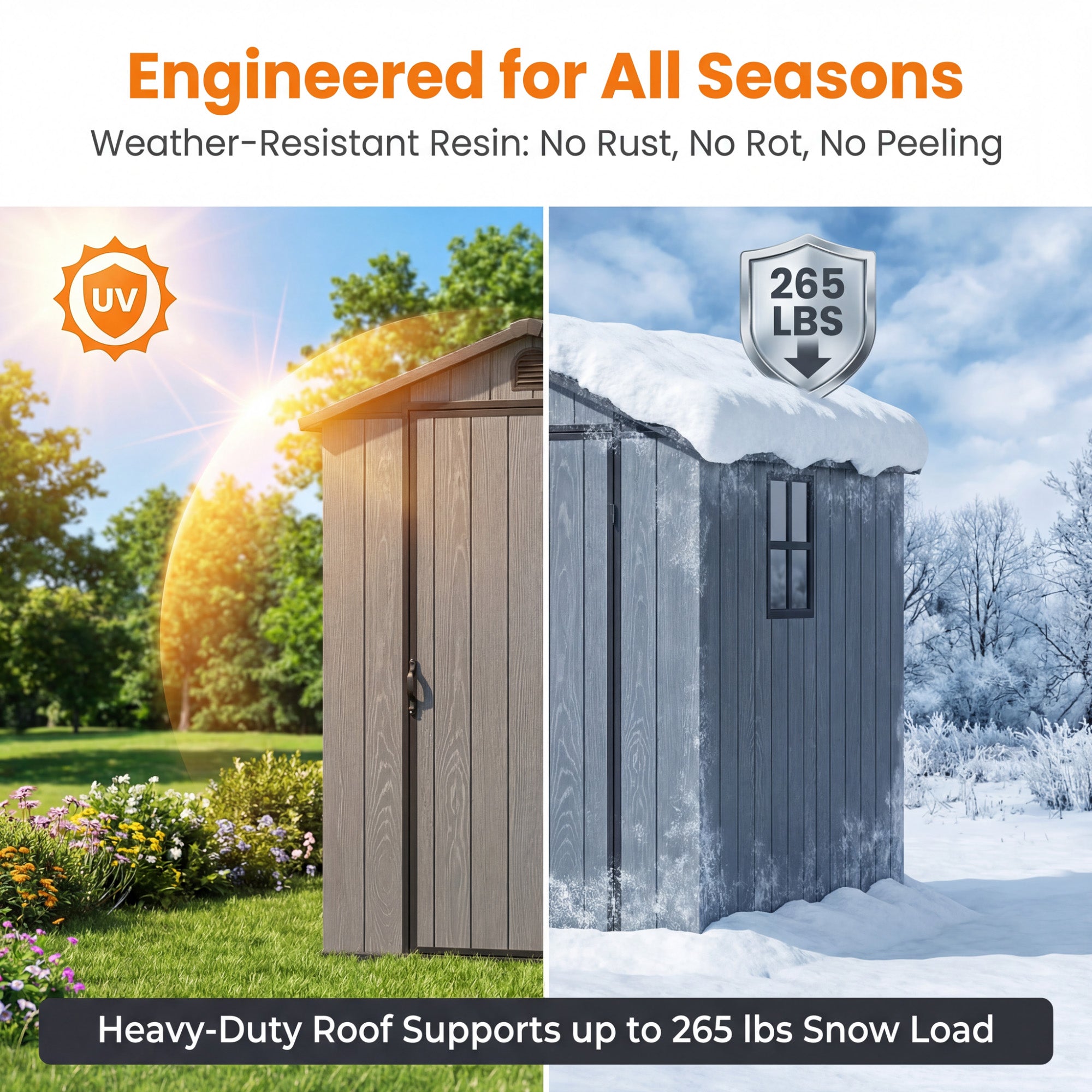 - Engineered for Extreme Weather: Built with premium, high-density resin and a reinforced structural frame, this storage shed delivers unwavering stability and long-lasting performance through storms, snow, and intense sun.