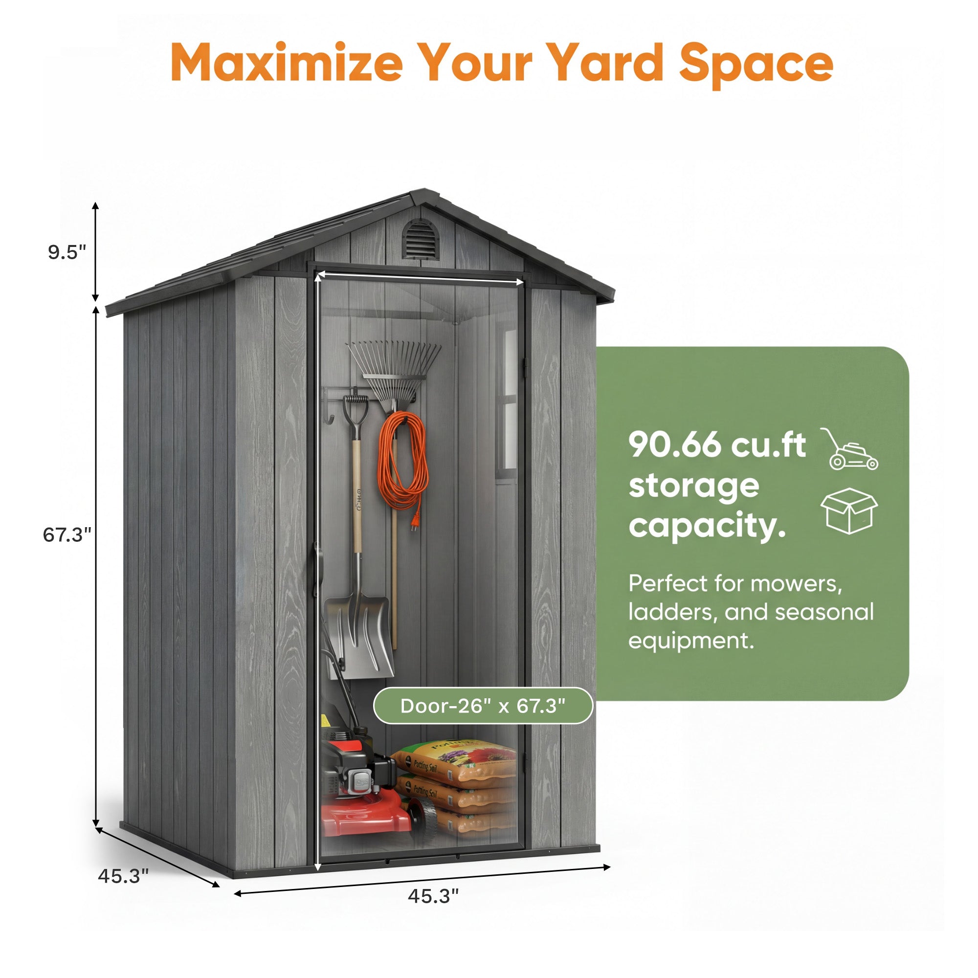 - 4x4FT Overall dimensions:45.3"L x 45.3" W x 76.8" H, Ample storage space ensures a clean and tidy patio, garden, backyard. Different types of tools can be neatly arranged in this tool room, such as bicycles, ladders, storage racks, and so on.