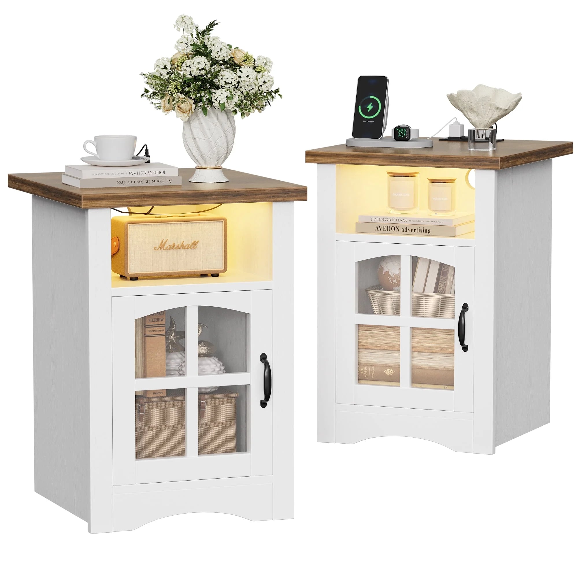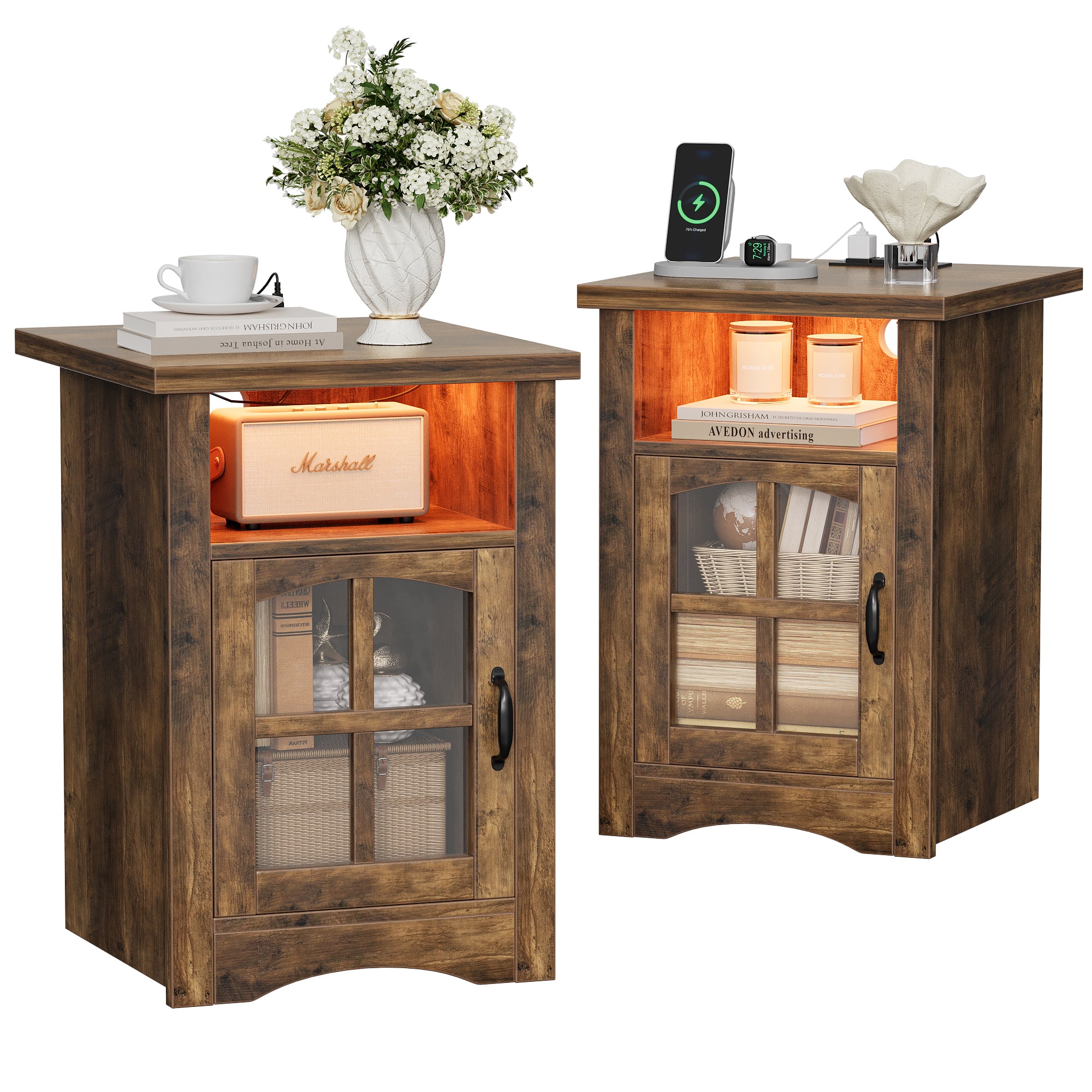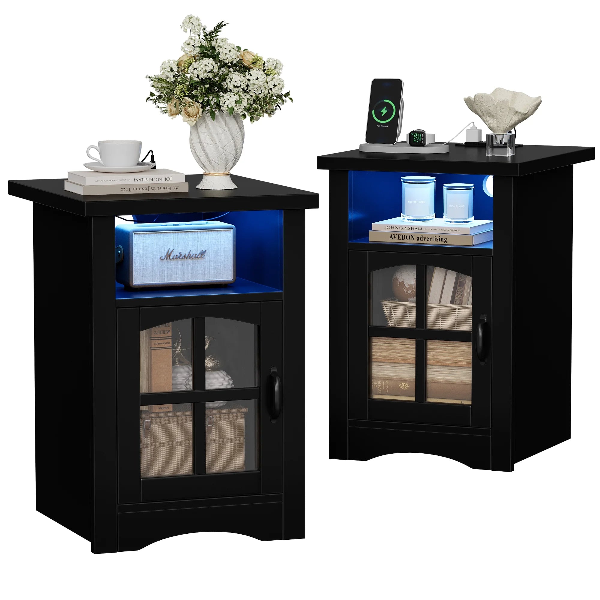 Homall Nightstand Set of 2 with Charging Station & Adjustable LED Lights, End Table Bedside Table with Glass Door & Open Shelf for Bedroom Living Room