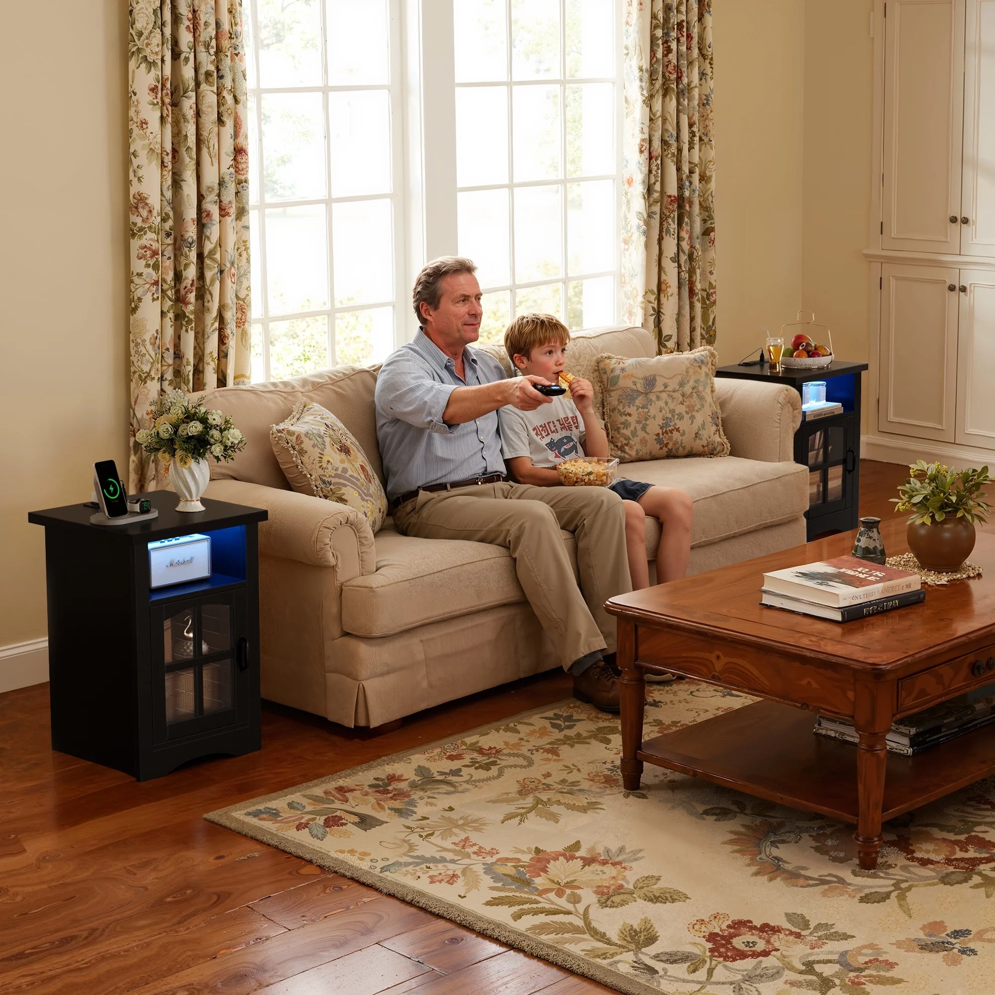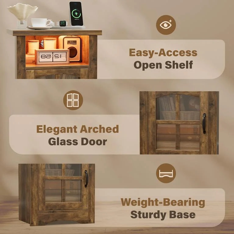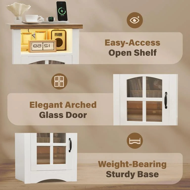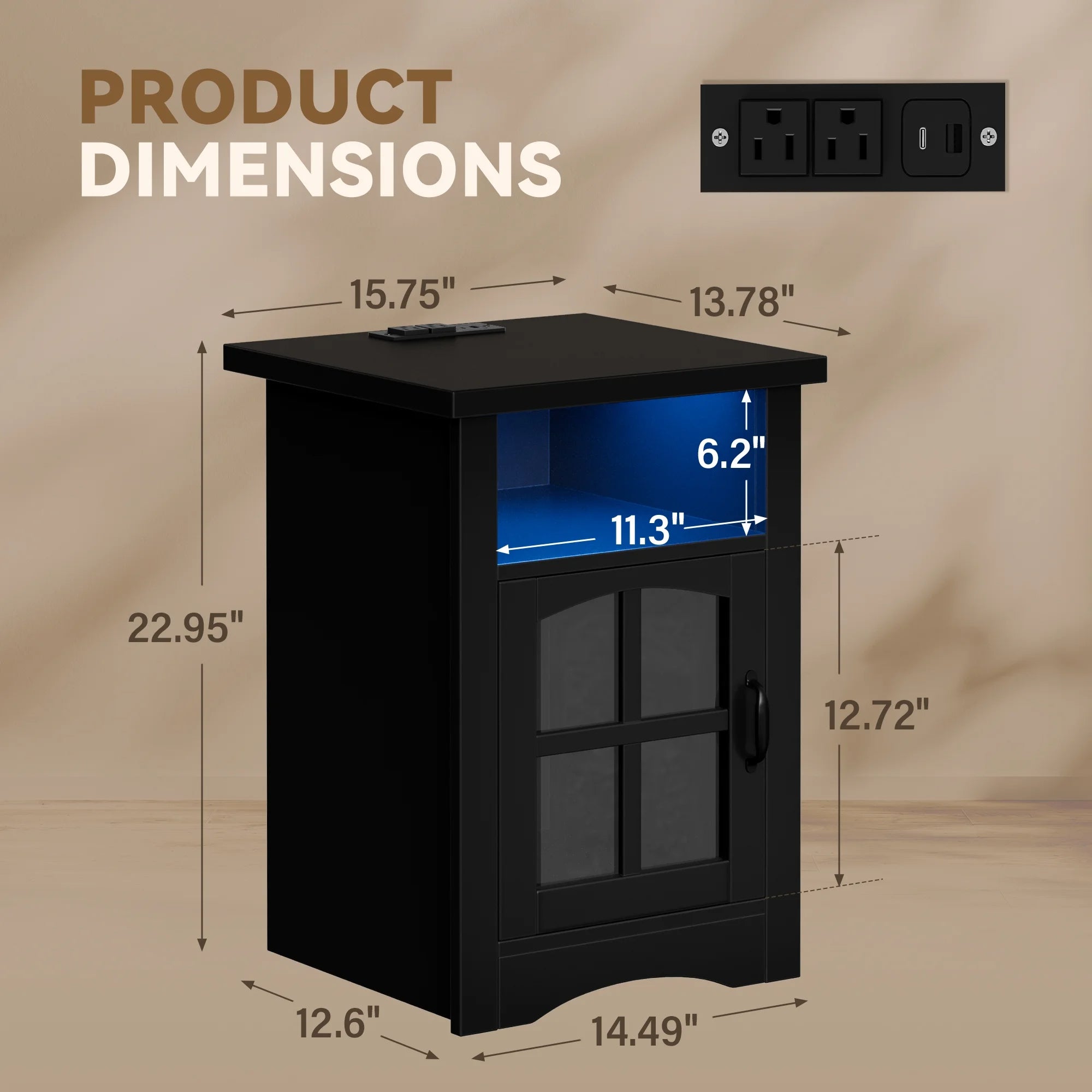 Homall Nightstand Set of 2 with Charging Station & Adjustable LED Lights, End Table Bedside Table with Glass Door & Open Shelf for Bedroom Living Room