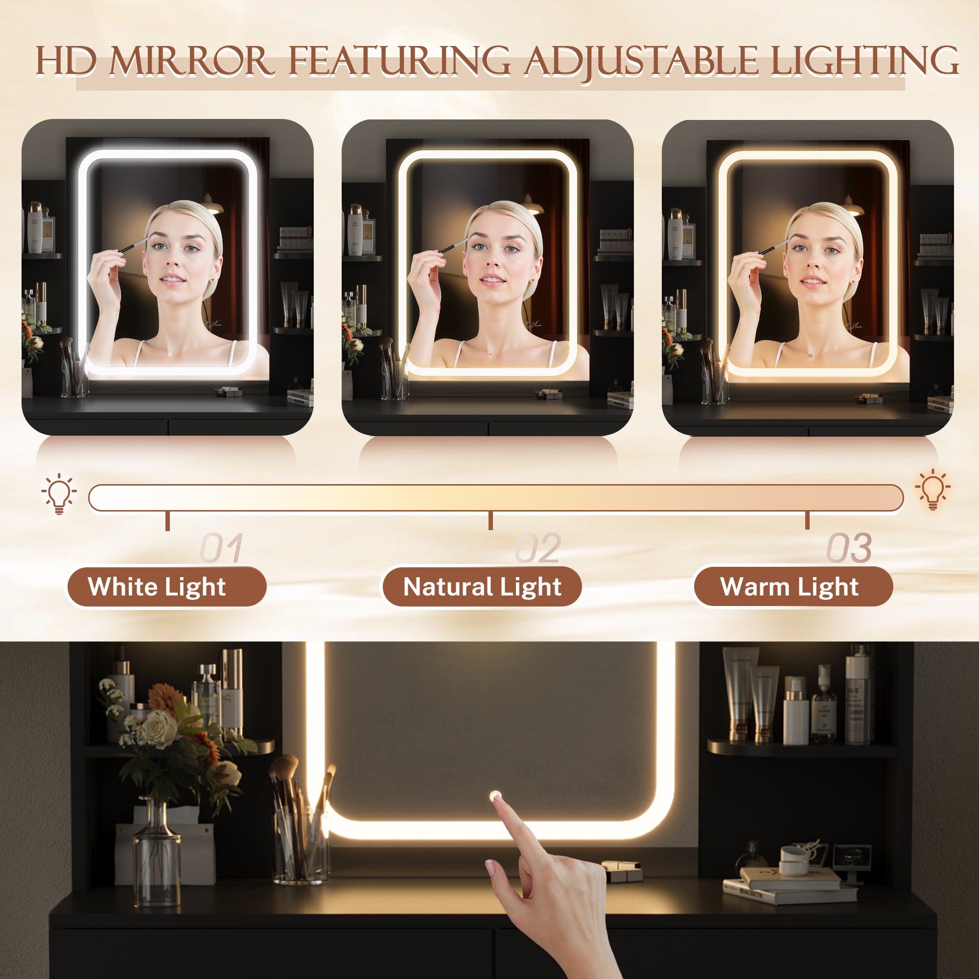 - 3-Color LED Lighted Makeup Mirror: Surrounded by energy-efficient LED strips, the mirror offers 3 light modes (cold white, warm white, warm yellow) via touch control. Long-press to adjust brightness, perfect for precise makeup application in day/night or various lighting environments.