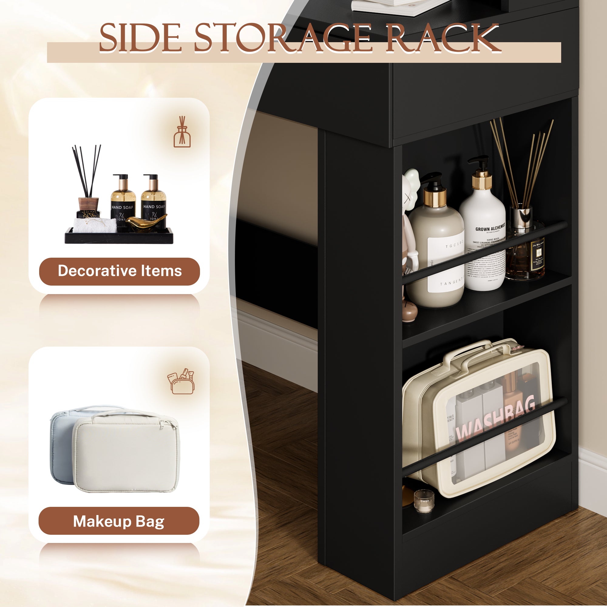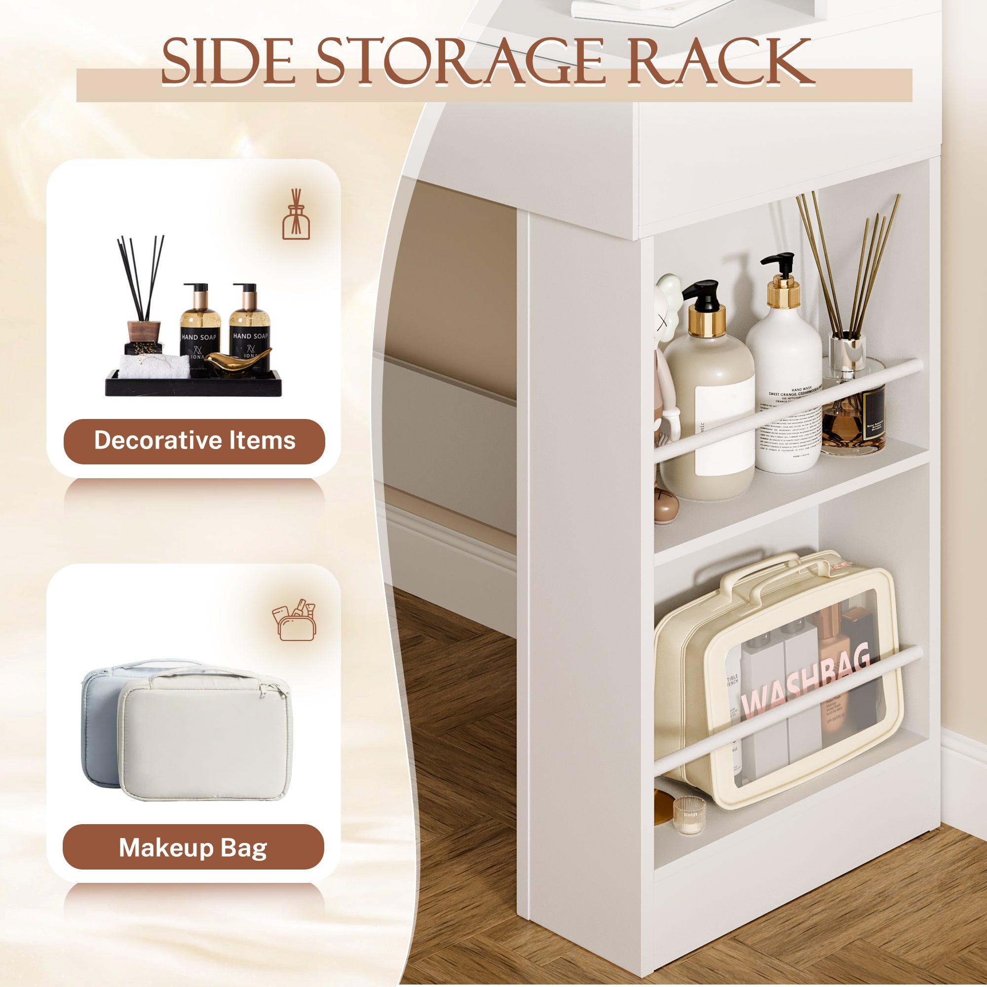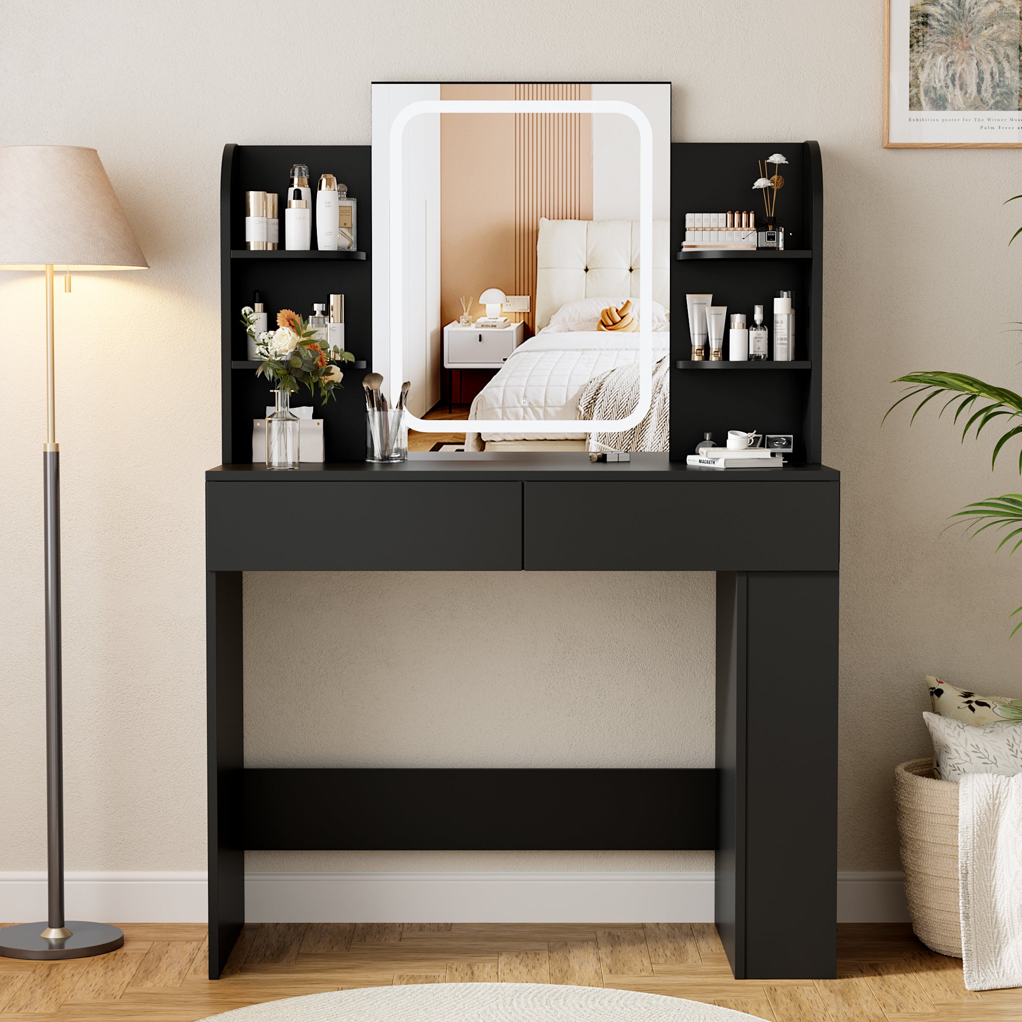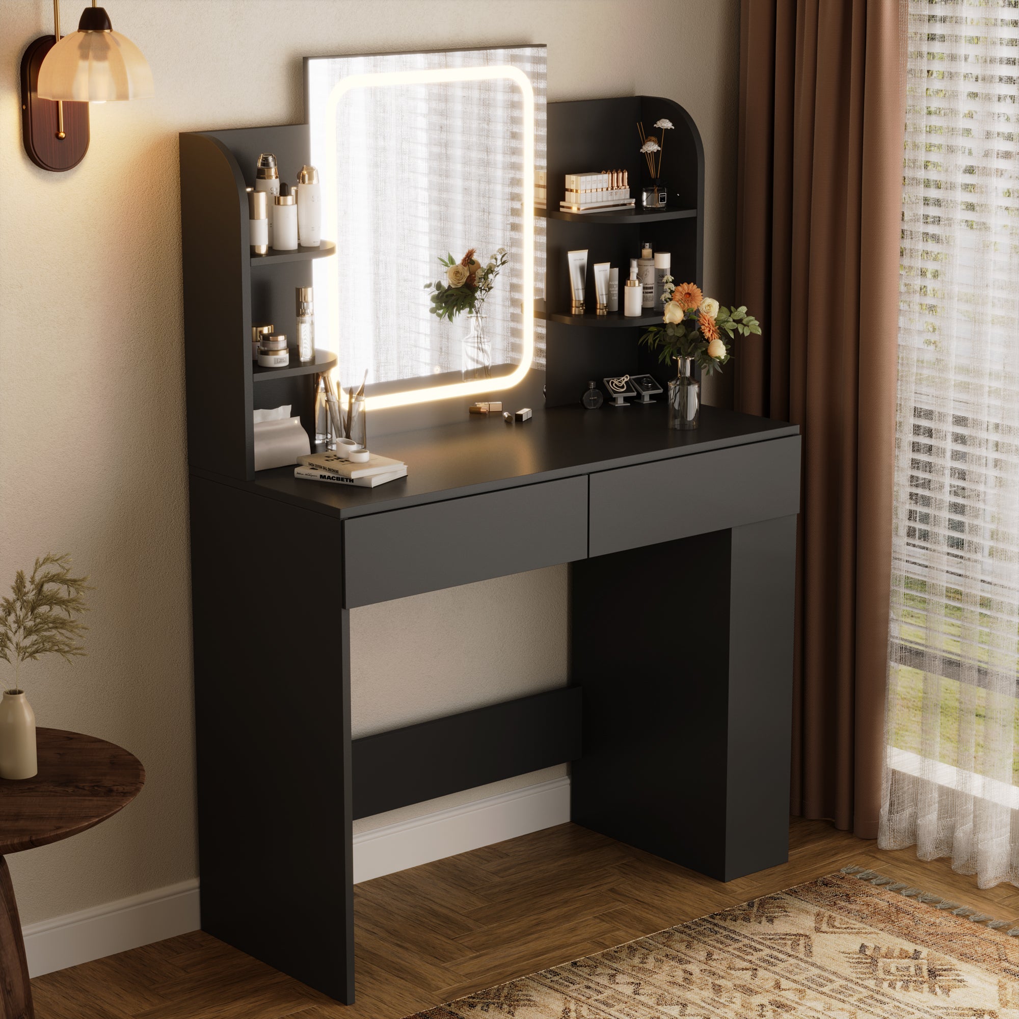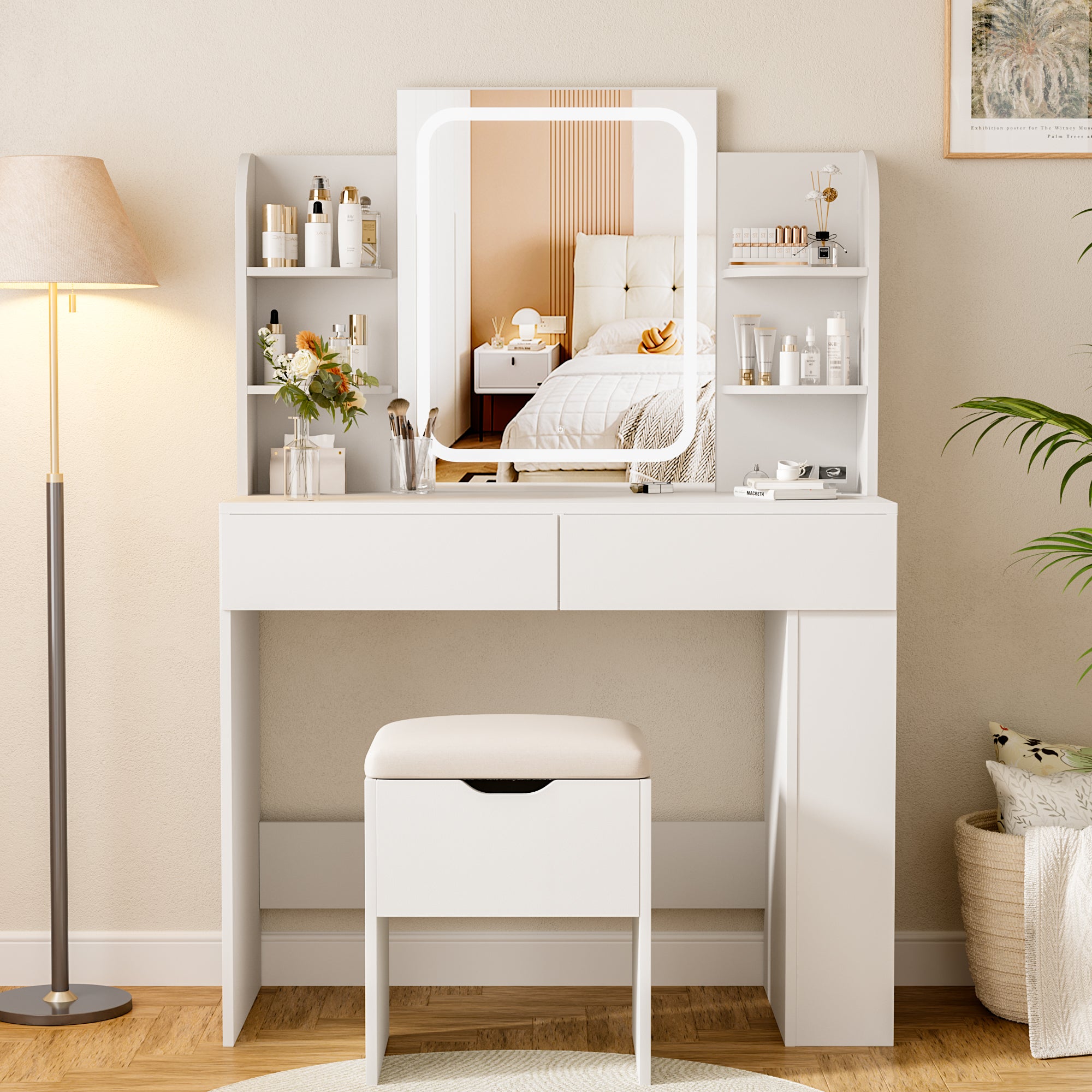 - Ample Storage & Organization: Equipped with 2 smooth-glide drawers, 4 tabletop open shelves, and 2 side racks, this vanity set keeps cosmetics, skincare, hair tools, and jewelry neatly sorted – no more cluttered countertops.